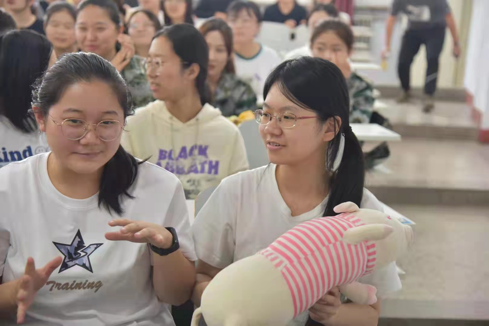 随后,刘榆萍同学主持师生互动环节。大家一起玩游戏,击鼓传花、扎气球等,教室里充满了大家的欢声笑语和浓浓的节日的氛围。