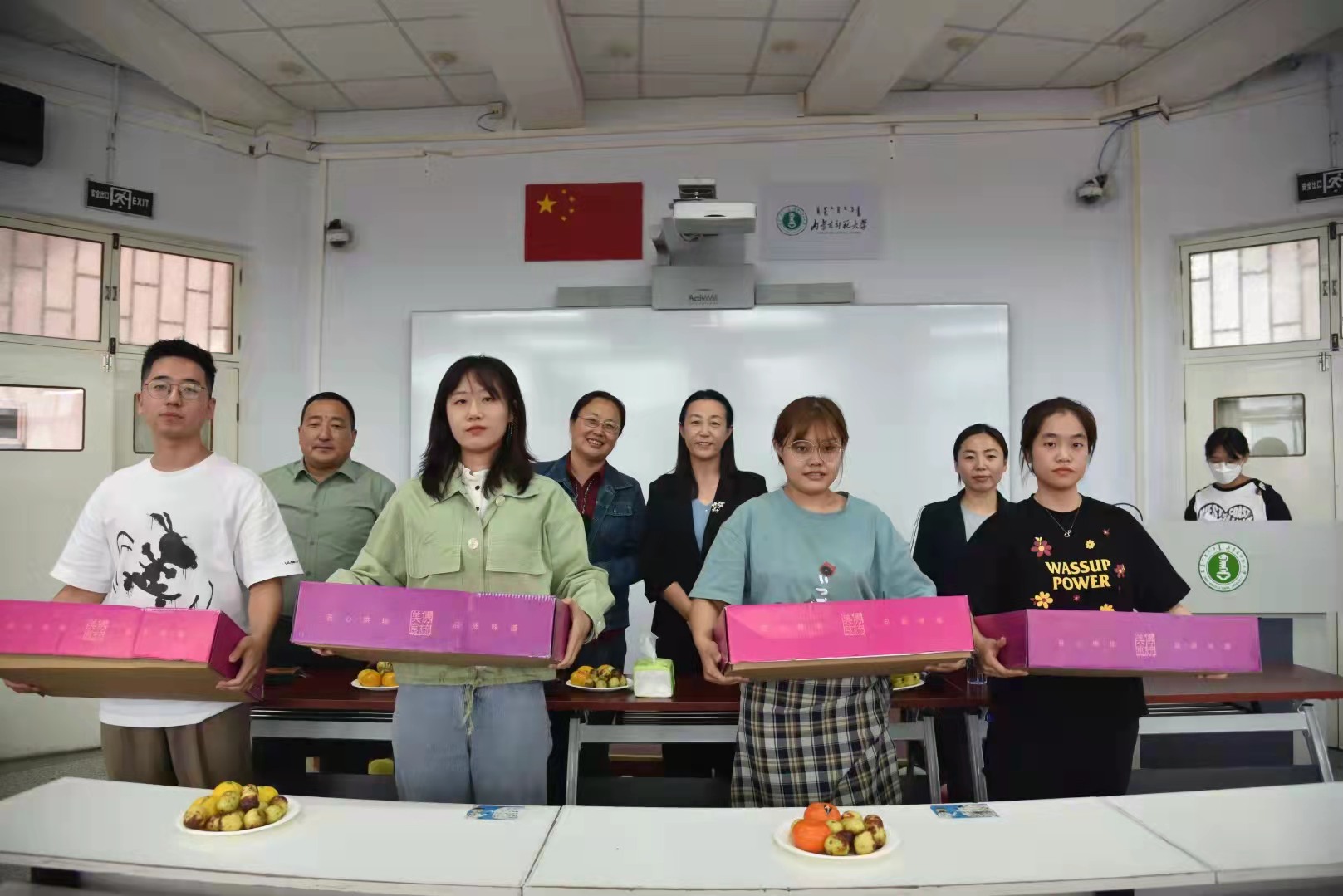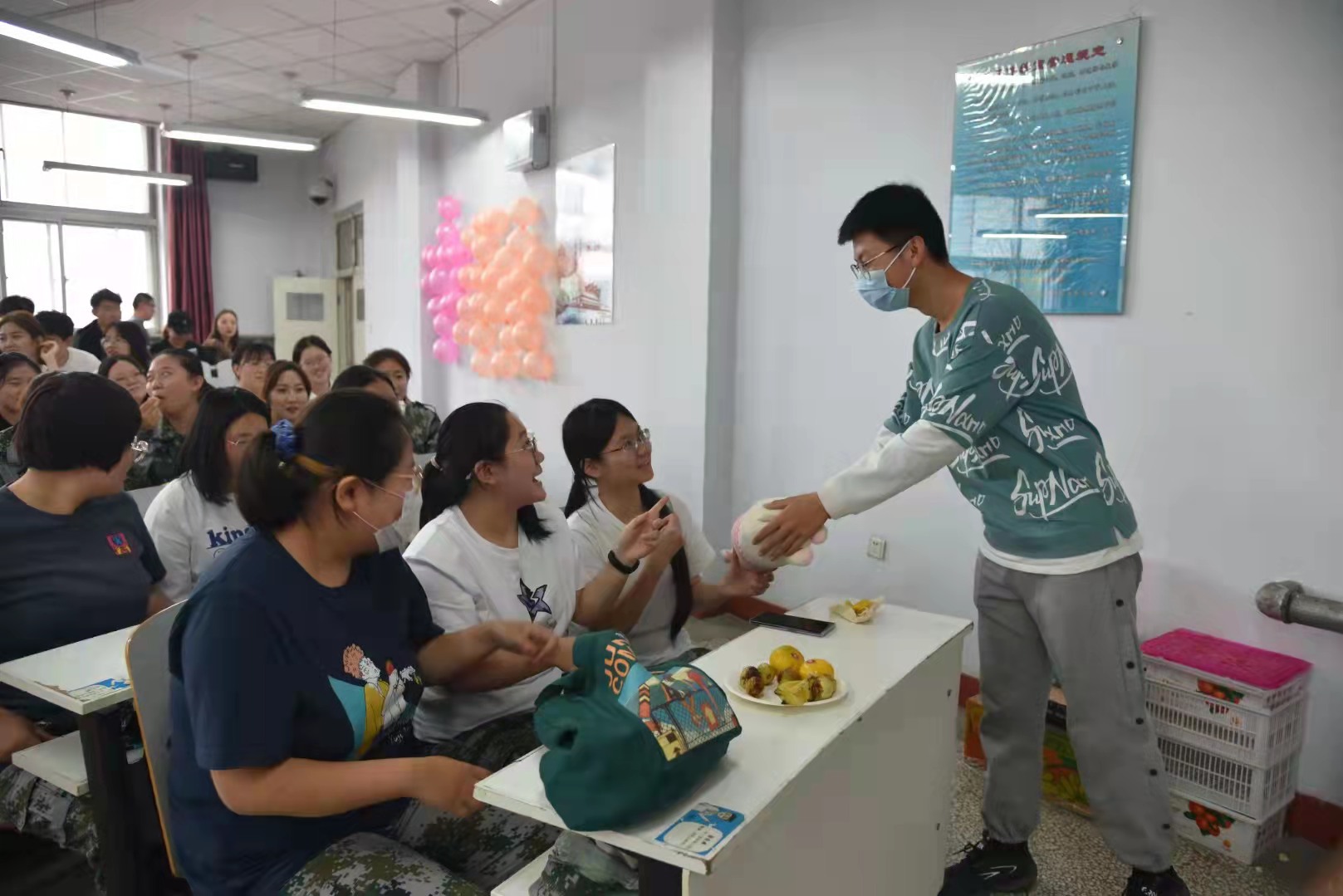 接着,包凤兰书记对到场的所有人员致以中秋节的慰问,并与现场的领导老师共同为同学们发放中秋节礼物,不论是月饼还是水果都饱含着各位领导老师对同学们的祝福。