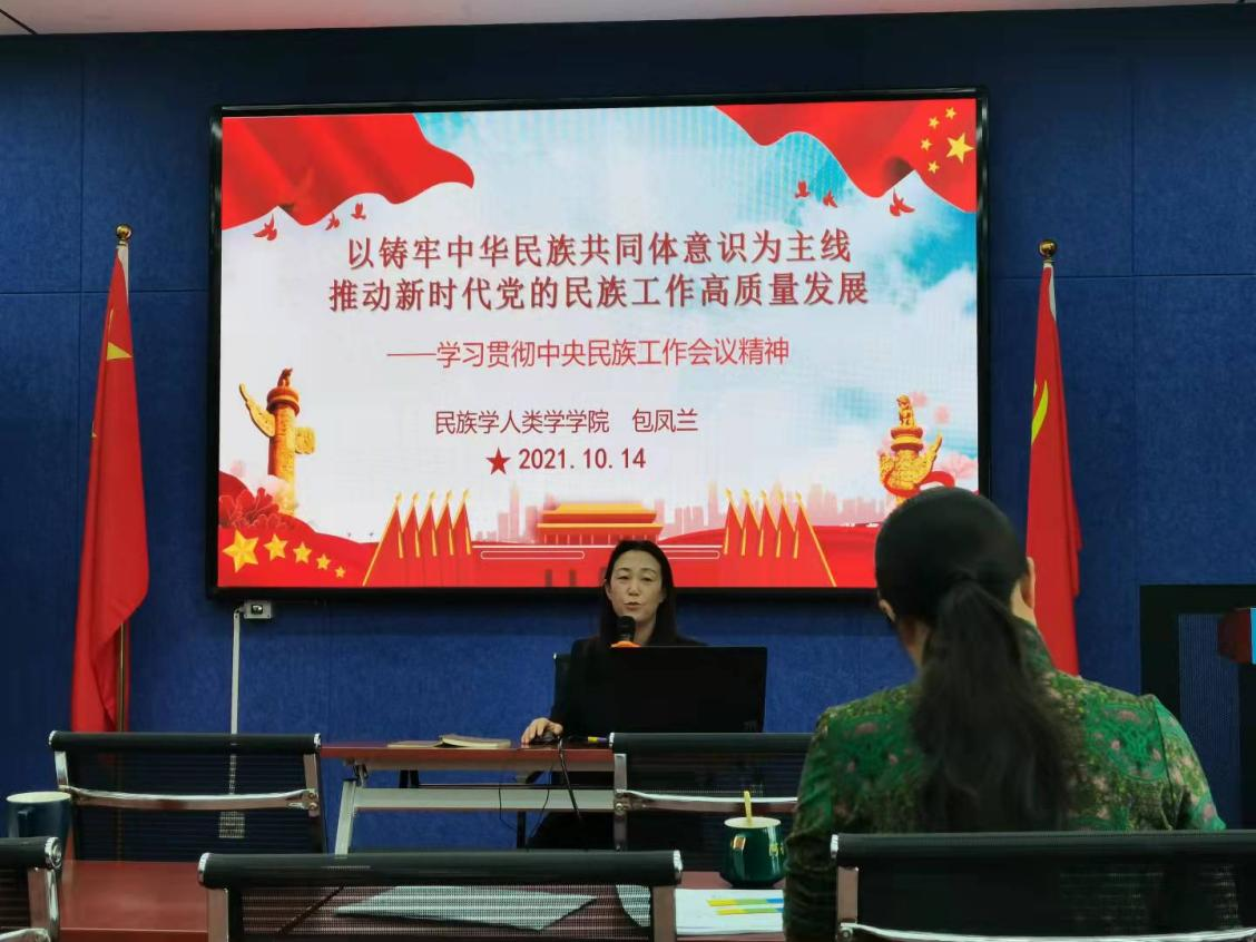 10月14日下午,best365官网党委书记包凤兰在田楼615会议室为全院教工做了题为“以铸牢中华民族共同体意识为主线,推动新时代党的民族工作高质量发展”的有关中央民族工作会议精神的宣讲。