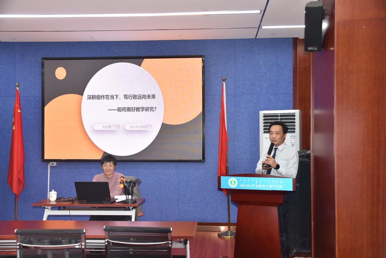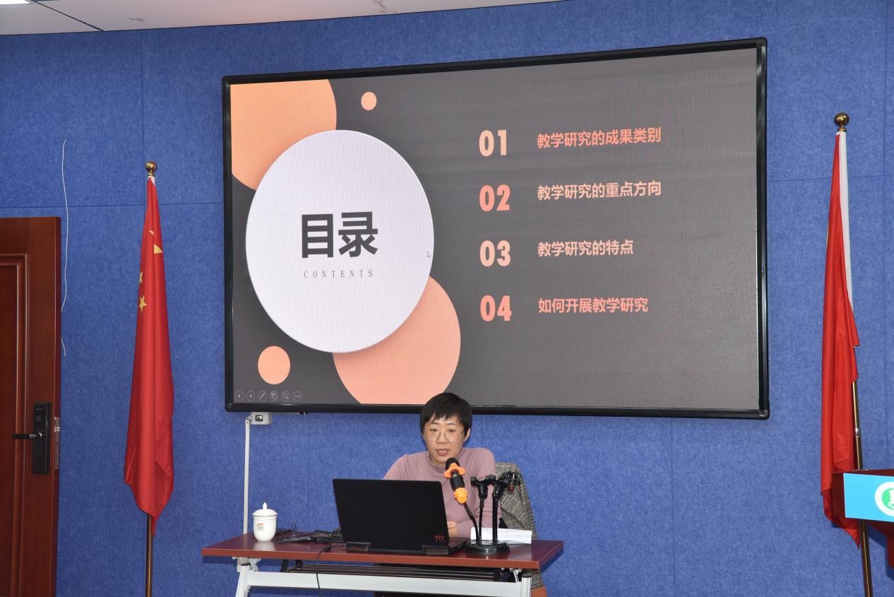 侯老师从教学研究成果类别、教学研究重点方向、教学研究的特点、如何开展教学研究等几个方面进行了具体的讲述,她说:必须准确、详细地进行收集和选择教育教学过程中的基础资料,并在研究过程注重逻辑性和实证性。而且,必须以现有的理论为基础,通过在教学过程中所获得的事实材料来检验理论或发展理论。