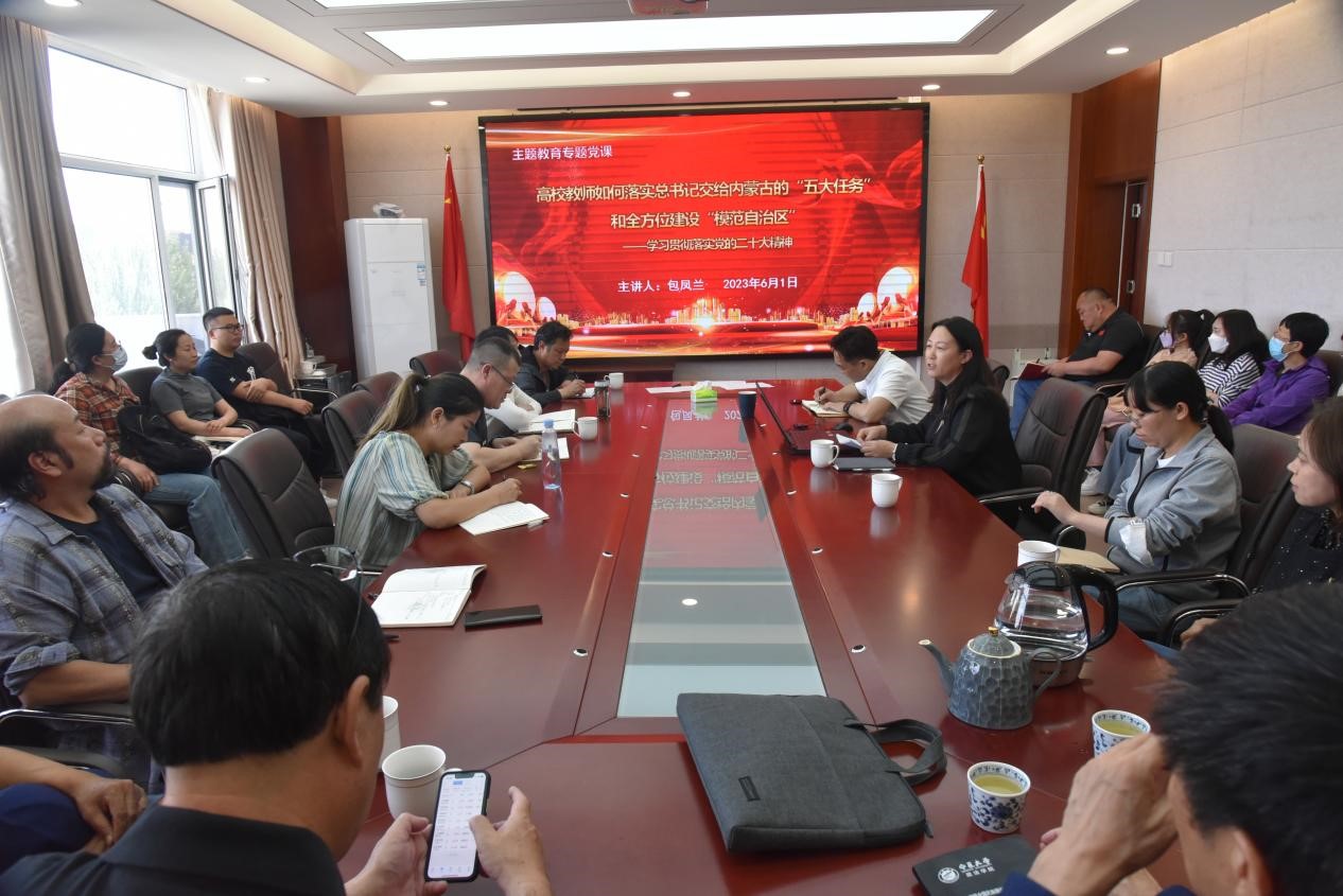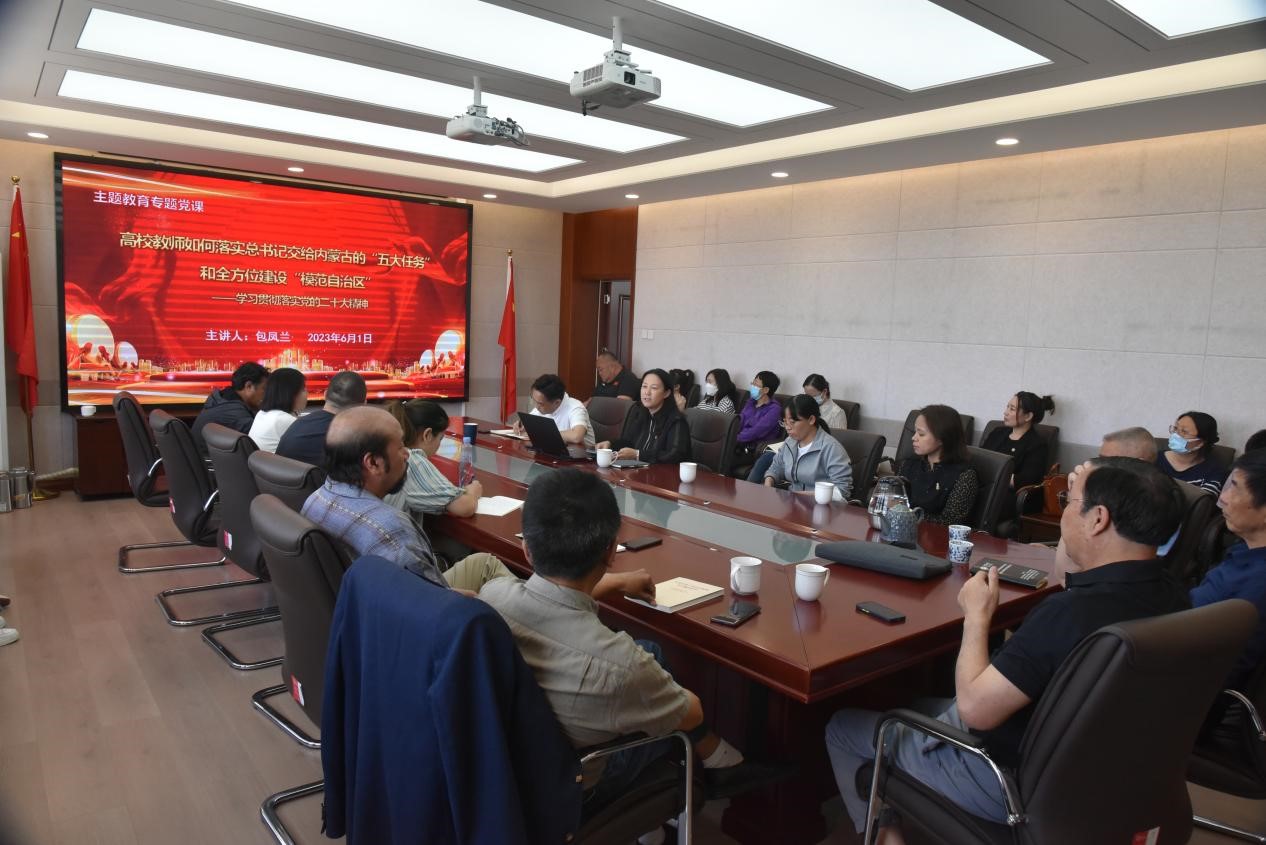 6月1日下午,best365官网党委书记包凤兰在田楼607会议室为学院教工做“高校教师如何落实总书记交给内蒙古的‘五大任务’和全方位建设‘模范自治区’”的主题教育专题党课。会议由党委委员、副院长满达主持。