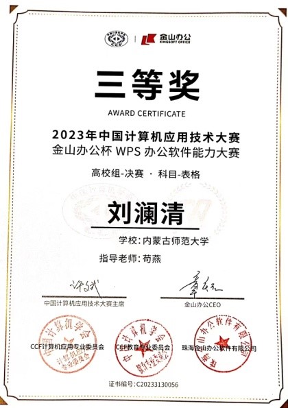 best365官网2022级社会学3班刘澜清同学在学校选拔赛中荣获“表格赛道”第一名,并被选派代表学校参加了全国总决赛。在全国总决赛中,我校荣获高校组团体第六名,刘澜清同学荣获高校组“表格赛道”个人三等奖。