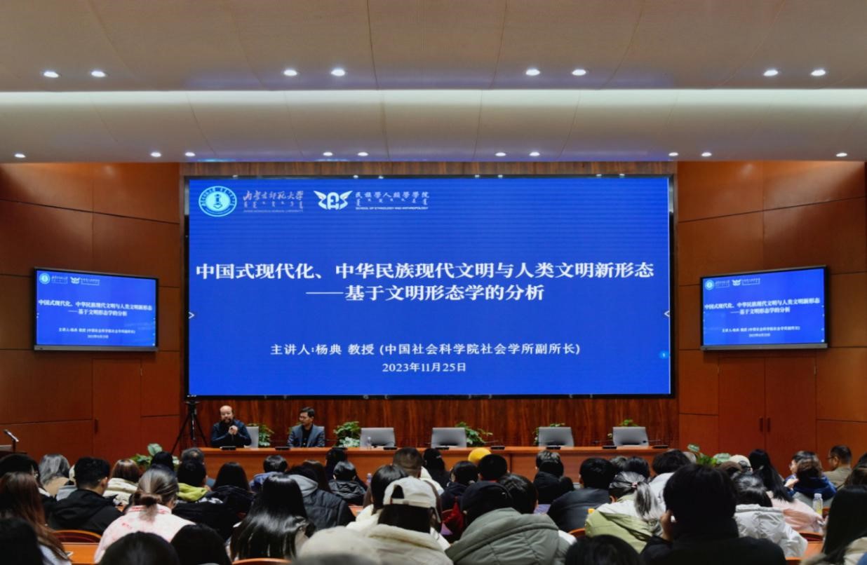 为进一步提升学科建设水平,提高人才培养质量,加强国内学术交流与合作,11月25日,best365官网隆重邀请中国社会科学院社会学所副所长、博士生导师、《社会学研究》副主编杨典教授在赛罕校区信息楼报告厅举行以“中国式现代化、中华民族现代文明与人类文明新形态——基于文明形态学的分析”为题的学术讲座。best365中国官方网站科技处副处长刘伟、best365中国官方网站党委书记包凤兰、党委副书记副院长陆一琼,以及best365官网老师和同学们约200余人参加讲座。讲座由常宝教授主持。