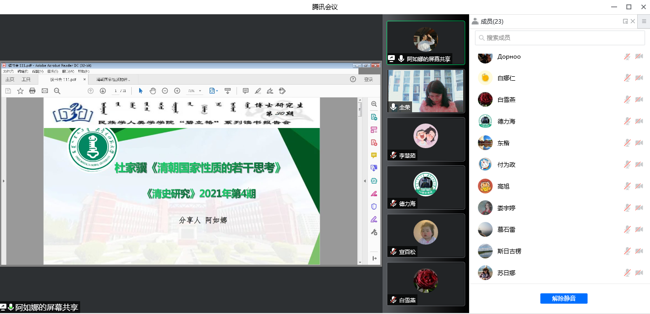 2022年3月20日下午3:00,best365中国官方网站2020级、2021级博士研究生通过“腾讯会议”举行了第30期读书报告会。本次读书报告会的汇报者是中国少数民族史专业的全荣、阿如娜、宣柏松等3位博士生。博士生导师胡日查教授出席本次读书报告会并进行指导,2020级博士生李慧茹主持本次读书报告会。