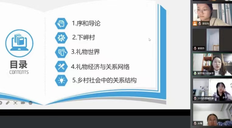 2022年4月28日晚best365中国官方网站2021级学硕一班在“腾讯会议”举行了第6期“碧立格”系列读书报告会。参加本次会议的五个专业有人类学、民俗学、宗教学、民族学、马克思主义民族理论与政策。本次读书会的汇报者是是来自2021级民族学专业的麻芳雪同学,汇报的书目是《礼物的流动》。民族学专业硕士研究生导师麦拉苏副教授出席本次读书报告会并进行了指导与评价。会议主持人是2021级民族学硕士研究生宣俭玲同学。会议主要分三大环节。分别是主讲人讲解《礼物的流动》这本书;全体参与发言与讨论;指导老师的点评。