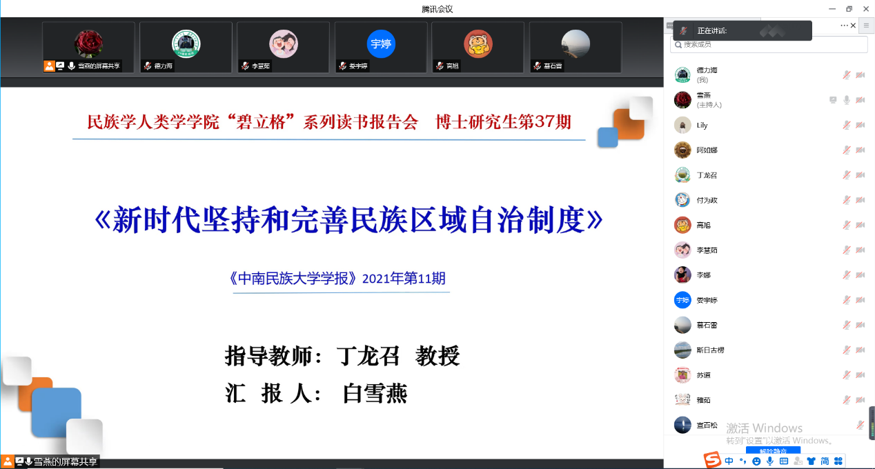 2022年5月8日下午3:00,best365中国官方网站2020级、2021级博士研究生通过“腾讯会议”举行了第37期读书报告会。本次读书报告会的汇报者是2020级马克思主义民族理论与政策专业李慧茹、2021级马克思主义民族理论与政策专业白雪燕两位博士生。博士生导师丁龙召教授出席本次读书报告会并进行指导。