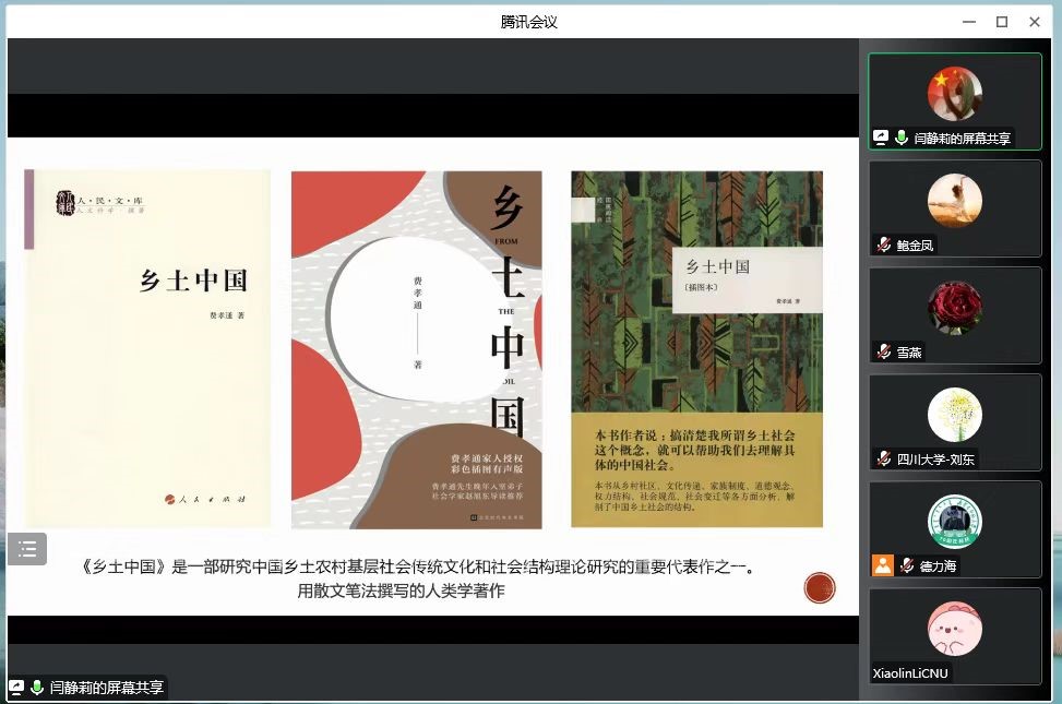 其次,由闫静莉同学分享费孝通的《乡土中国》一书。主要从4个方面展开:著作简介、相关研究背景、内容简介、个人反思与专家学者观点。《乡土中国》是一部研究新中国成立初期,乡土农村基层社会传统文化和社会结构理论研究的重要代表作之一。本书来源于作者20世纪40年代后期在西南联大和云南大学所讲的“乡村社会学”一课的内容。费孝通先生用通俗、简洁的语言,分别从乡土社会人文环境、传统社会结构、权力分配、道德体系、法礼、血缘地缘等方面,介绍了中国乡土社会的一些基本特点,论述了中国社会是乡土性的,我们从泥土里来,也离不开泥土。以及中国人的人际关系,道德观念,家庭观念,管理意识,都与那一方泥土有着密不可分的联系。解剖了中国乡土社会的结构及其本色从乡土文化、家族制度、道德观念、权力结构、社会规范、社会变迁等诸多方面分析。对中国的基层社会的主要特征进行了理论上的概述和分析,展现了中国基层社会的面貌。每篇之间相互递进,细化,阐释。用通俗、简洁的语言对中国的基层社会的主要特征进行了概述和分析。并创造性地提出了“差序格局”和“礼治秩序的概念。分享最后,引用了纳日碧力戈教授的观点对本书进行了客观性的总结。