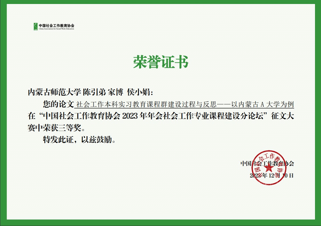 best365官网陈引弟老师在分论坛发言,同时其与侯小娟、家博两位老师合作论文《社会工作本科实习教育课程群建设过程与反思——以内蒙古A大学为例》荣获分论坛三等奖。2021级社会工作专业本科生陈元照、陈立冬两位同学的论文入选分论坛“社会工作实务各领域发展与实践”,并参与汇报。