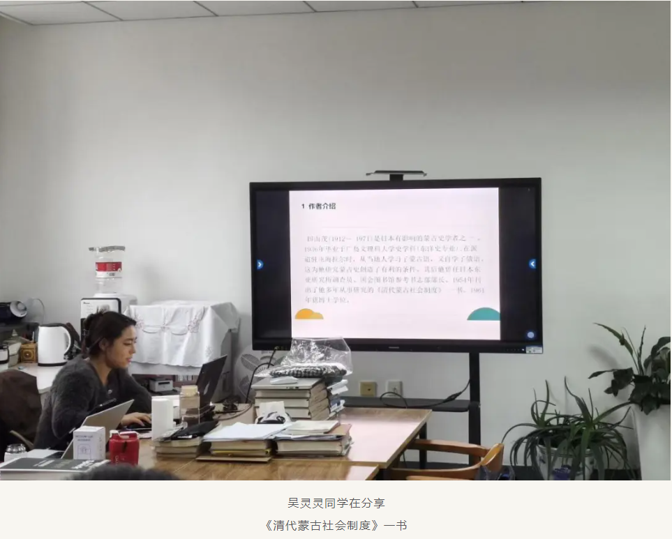 首先,吴灵灵同学分享的是日本蒙古史学家田山茂的著作《清代蒙古社会制度》一书,重点介绍清代部分,该书主要以清代蒙古“旗”的设置、组织和机能为中心展开论述,通过对旗与人、旗与土地等问题的剖析,阐明了蒙古的社会关系、社会制度与社会状态,从而开拓了清代蒙古社会制度的新领域。吴灵灵同学在著作的主要内容和研究范围及研究角度等几个方面详细解读,并以PPT展示给大家。让同学们了解到自十三世纪至清末蒙古社会制度及其变迁,并且强调了研究社会制度要注重研究下层结构,注重多角度、多层面的历史研究。